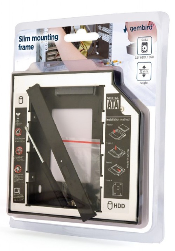 Ovaj praktični tanak ram može da se instalira u slobodnom SATA slotu 5,25"(optika kod laptopa). Možete ga instalirati umesto DVD-ROM drajva. Ovo vam omogućava da koristite dodatni 2.5" SATA HDD na računaru.